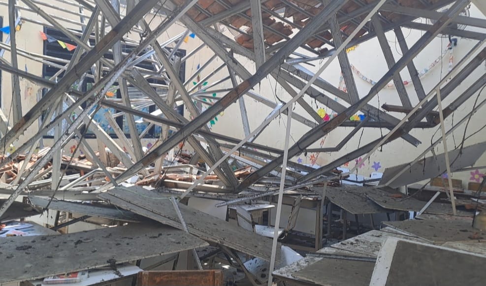 Dalam sebuah video yang viral di media sosial terlihat atap ruang kelas yang terbuat dari rangka baja dan genteng merah runtuh hingga menyentuh lantai.
