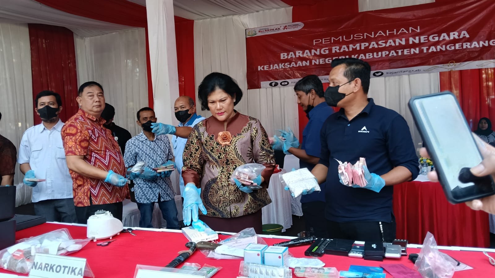 Kepala Kejaksaan Negeri Kabupaten Tangerang Afrillyanna Purba mengatakan beberapa barang bukti yang dimusnahkan adalah, uang palsu sebanyak 1.4444 atau dengan nominal Rp 140 juta, obat-obatan keras yang dijual dan atau dimiliki tanpa izin, jenis Tramadol sebanyak 50.717 butir, jenis Hexymer sebanyak 46.022 butir, jenis Trihexyphnidyl sebanyak 400 butir.